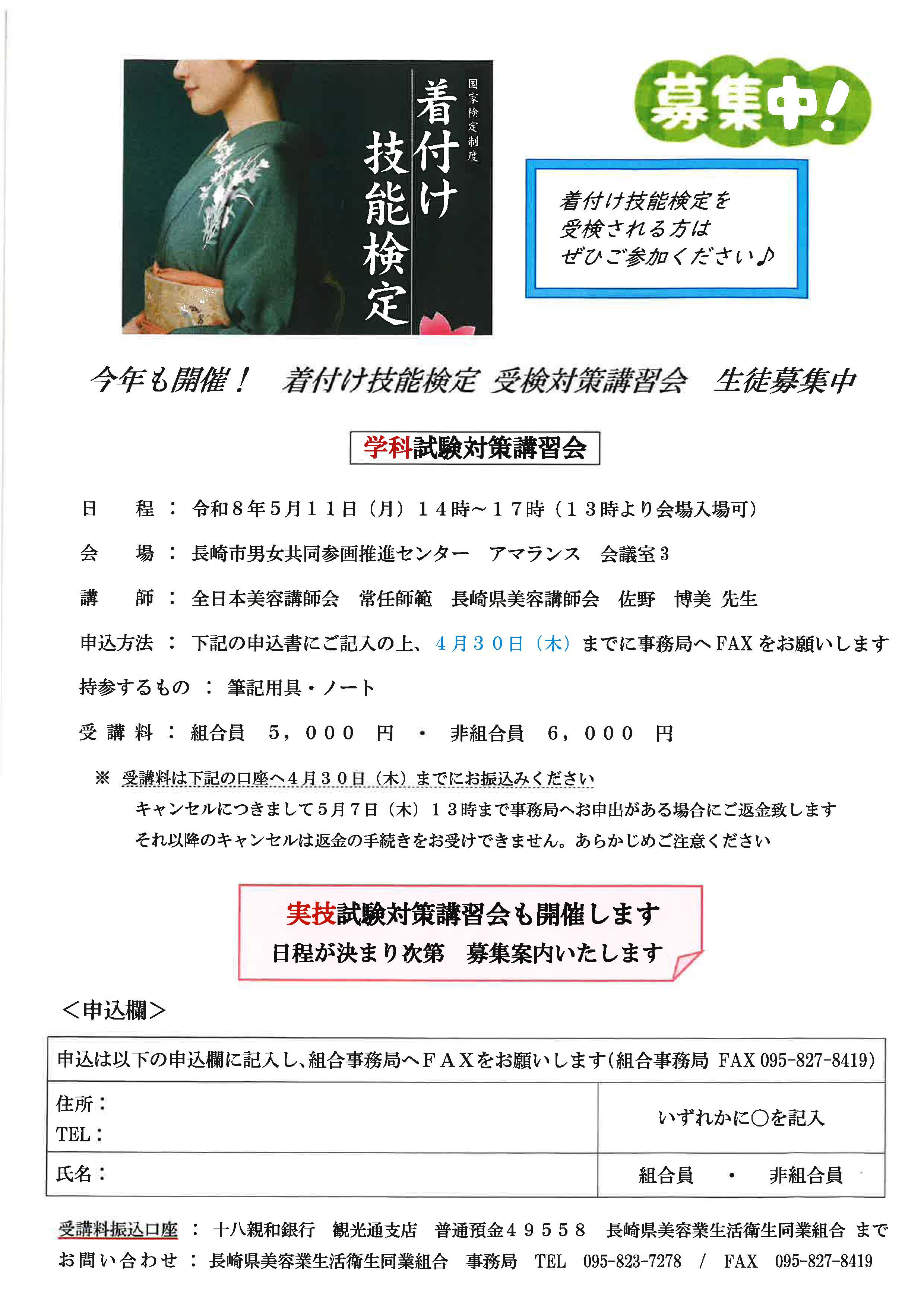 着付技能検定 受検対策講習会 生徒募集